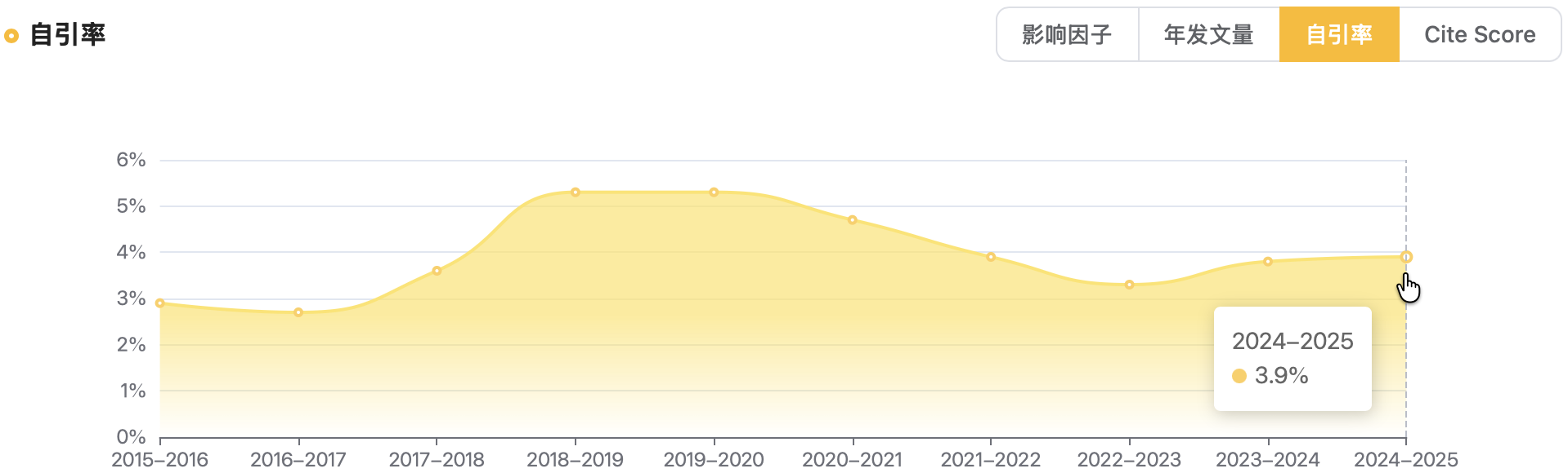 该杂志的自引率一直在6%以下,2024-2025年自引率为3.9%,科研独立性强。