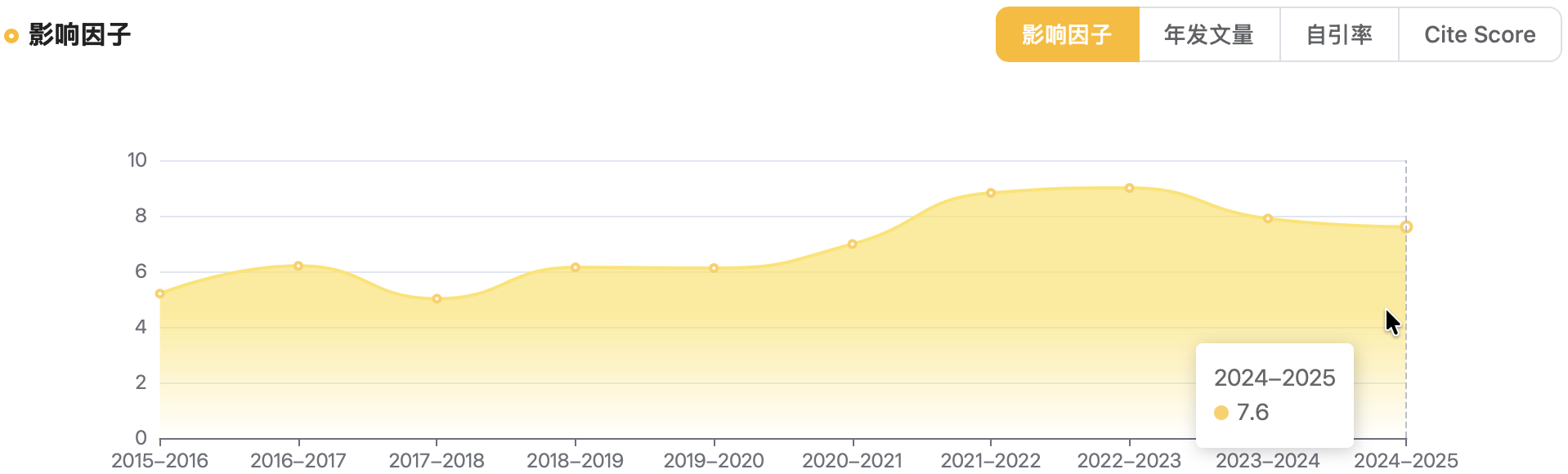 该期刊近3年影响因子处于下降状态,2024-2025年降至7.6分,在顶刊中属于较低水平。