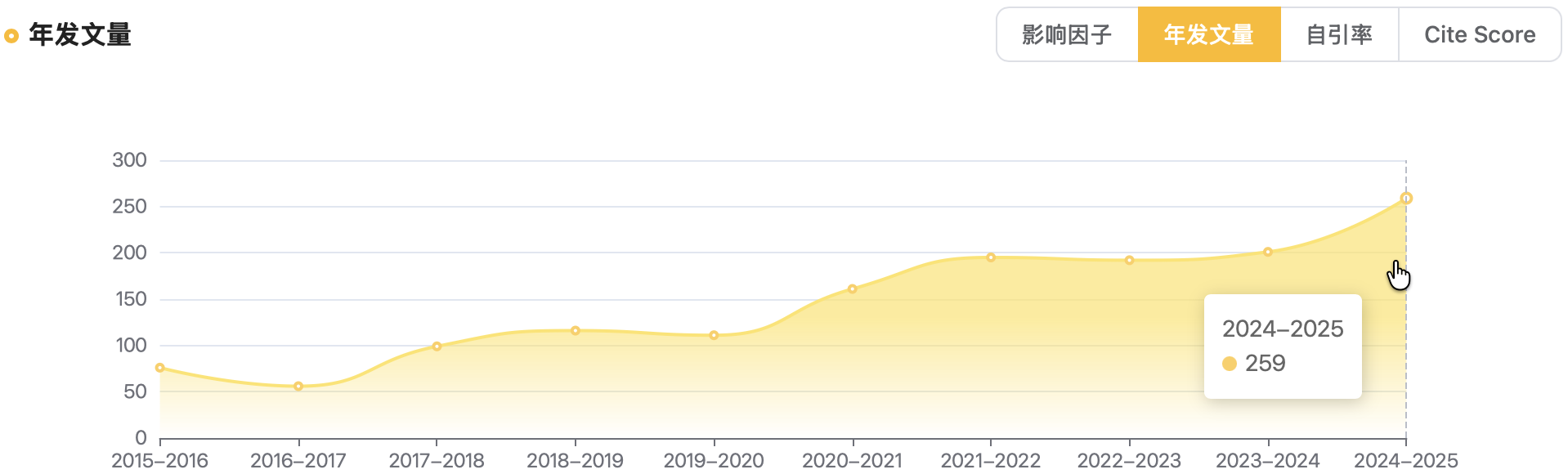 该杂志年发文量呈上升趋势,2024-2025年达到259篇,增大了成功发文的机率。